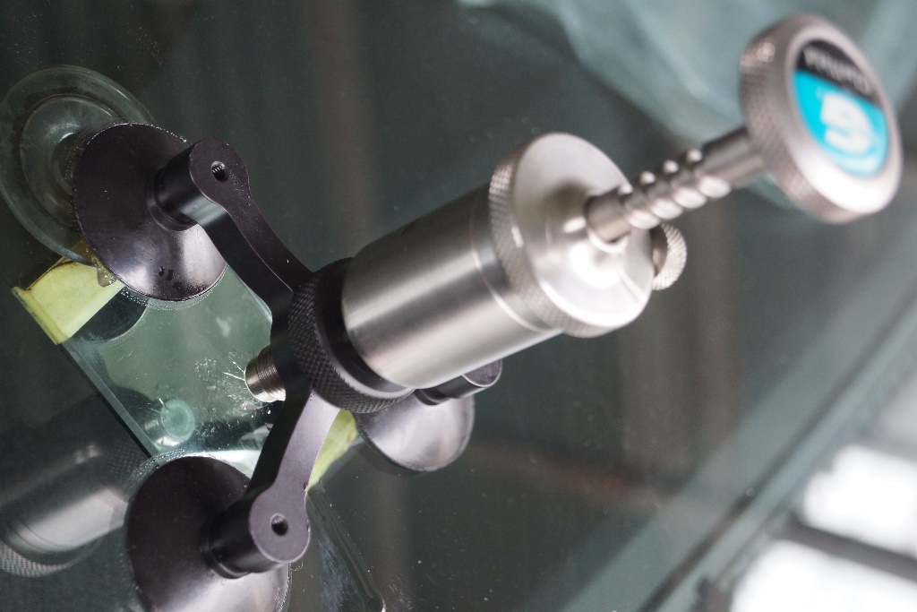 フロントガラスにできた飛び石などによるヒビ割れを専用の器具で丁寧に修理していきます。